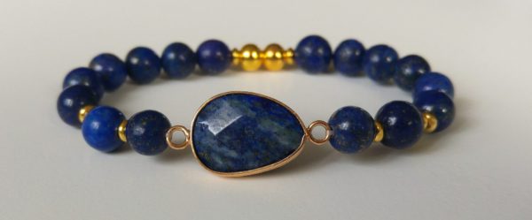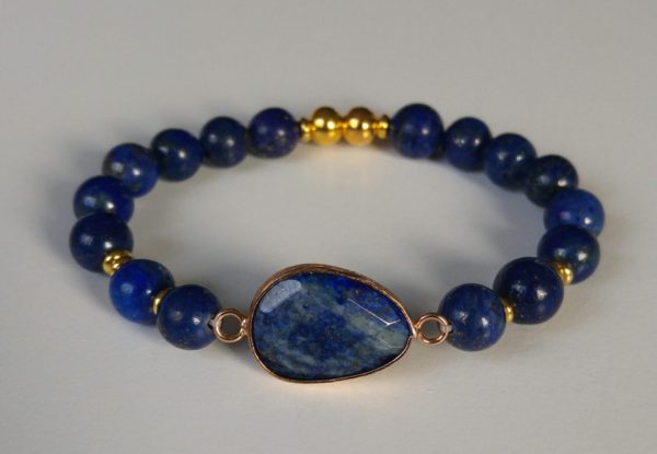 Elastiskt armband med en guldfärgad lapis lazuli-connector, lapis lazulipärlor och guldfärgade mellandelar.