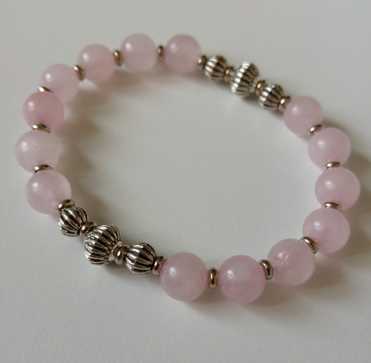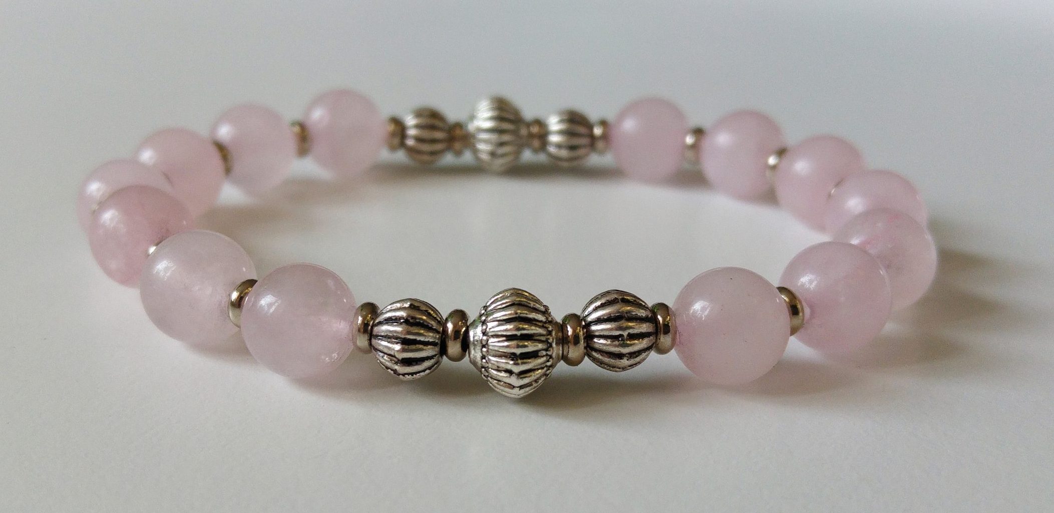 Material: Detta armband är skapat med en stark elastisk tråd för en bekväm passform och enkel på- och avtagning. Pärlorna är rosenkvarts och räfflade antiksilverfärgade mellandelar i metall.