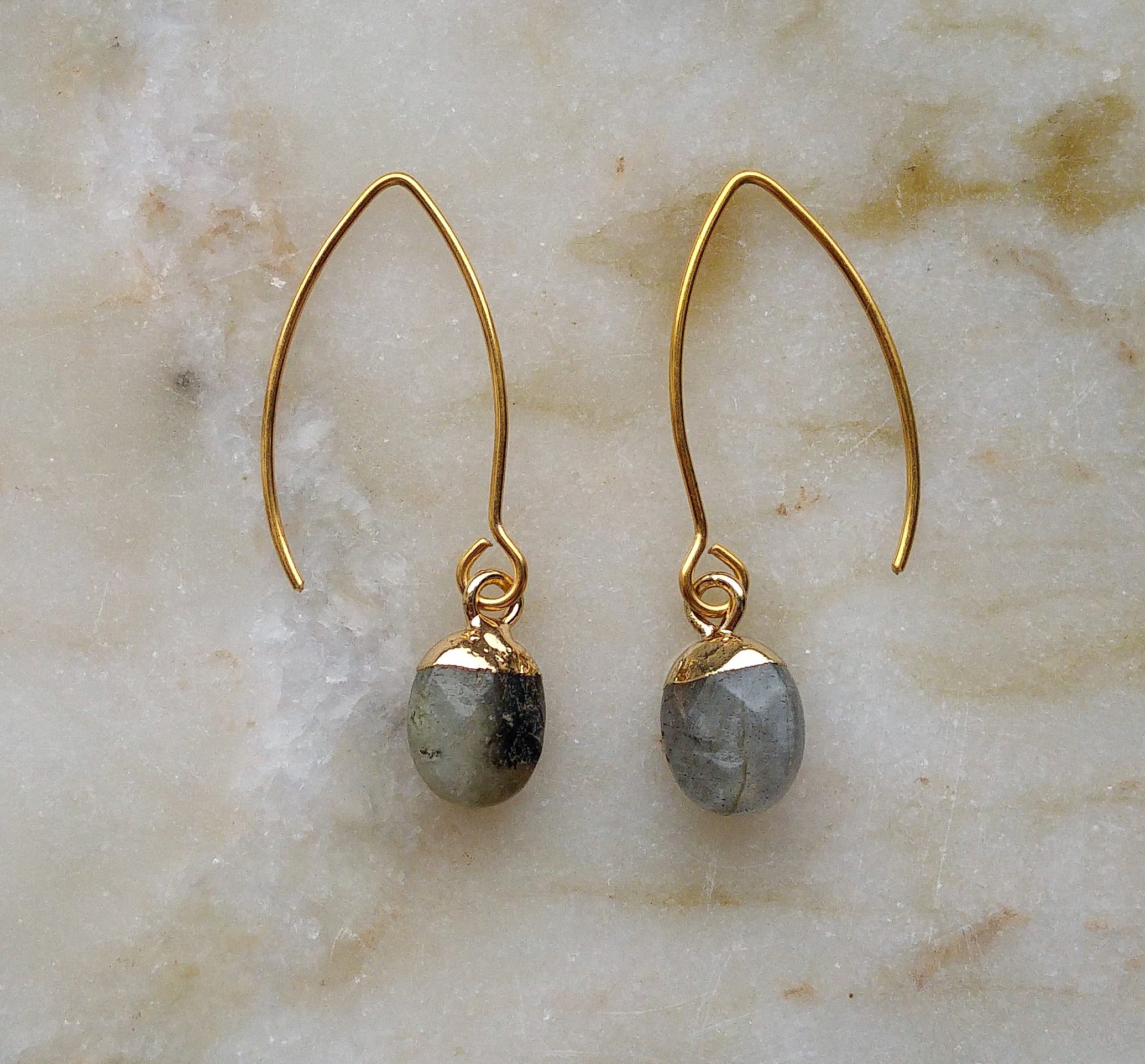 Guldfärgade (v-formade) örhängen i rostfritt stål med guldfärgade ovala labradorit-berlocker.